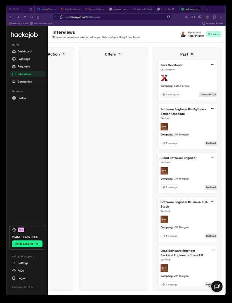 - I deleted my Hackajob account, because all I had was interest from JPMC and LMAX, which mandate on-site work.